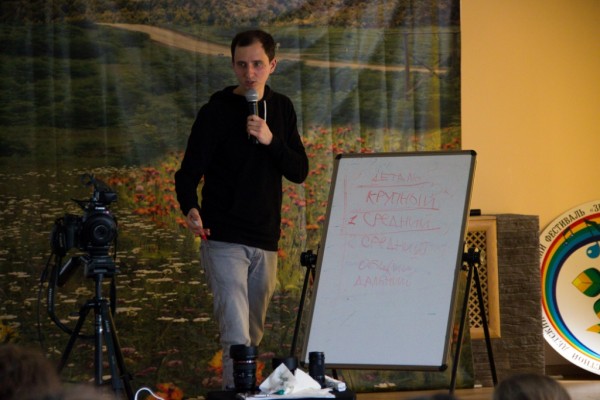 Затем все участники фестиваля переехали в оздоровительно-досуговый центр «Юбилейный». Программа продолжилась практическими мастер-классами. С опытным лесничим Р.Жуковым ребята учились правильно сажать дерево, сахалинский оператор С.Штангель познакомил с основами кинопроизводства, а студенты театрального колледжа СахГУ провели мастер-класс по сценической речи. А вечером состоялся большой игровой круговорот знакомств.