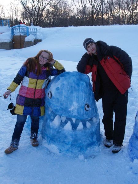 Почти два часа шла творческая работа, и в результате на льду озера появились герои праздника – киты, а также – акула, сивуч и морская звезда, краб и осьминог.