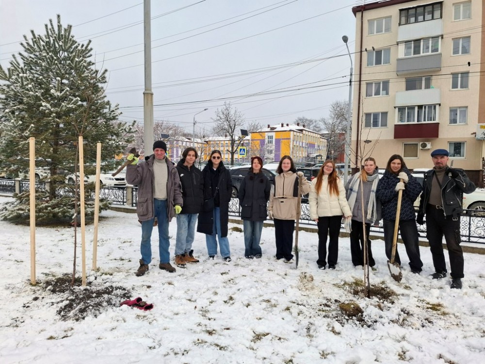 После обеда волонтеры «Родника» успели посадить два дерева – яблоню и черемуху – в сквере Чехова (снег - не помеха).