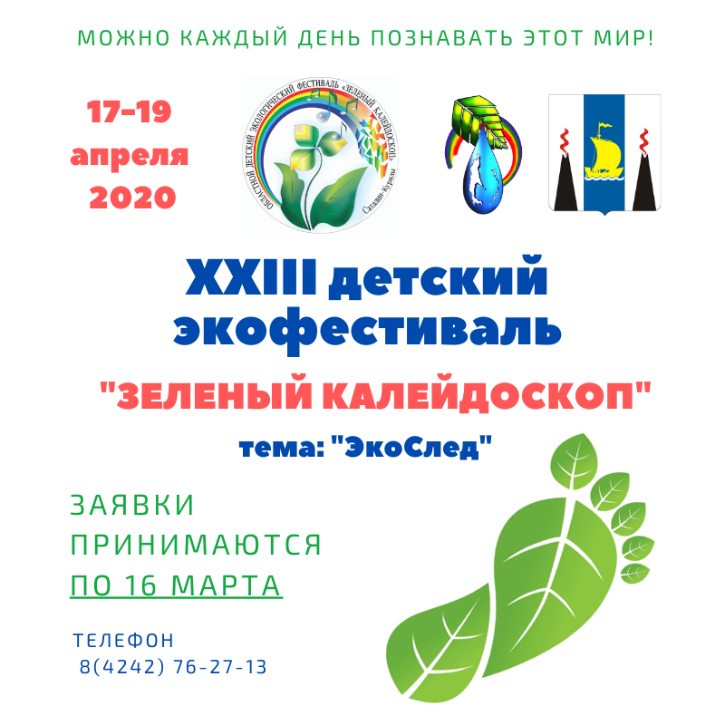Рады пригласить вас принять участие в XXIII детском экологическом фестивале «Зеленый калейдоскоп», который состоится 17-19 апреля 2020 года в г. Южно-Сахалинске.