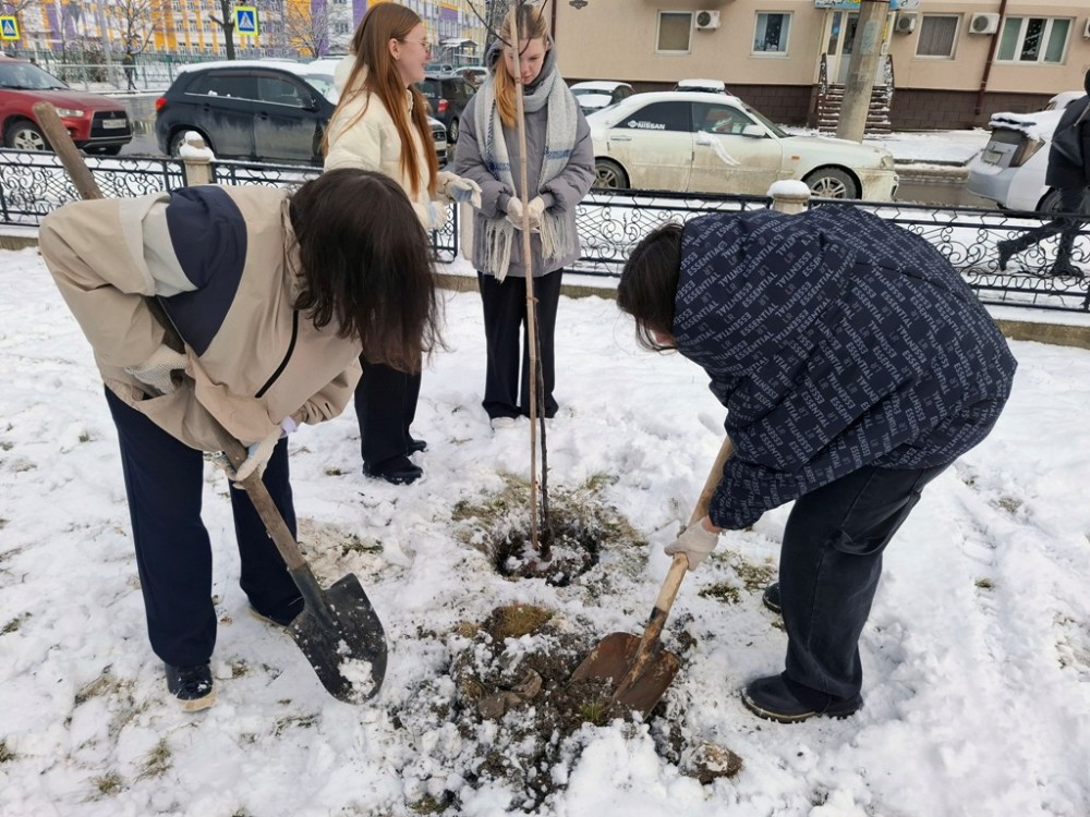 После обеда волонтеры «Родника» успели посадить два дерева – яблоню и черемуху – в сквере Чехова (снег - не помеха).